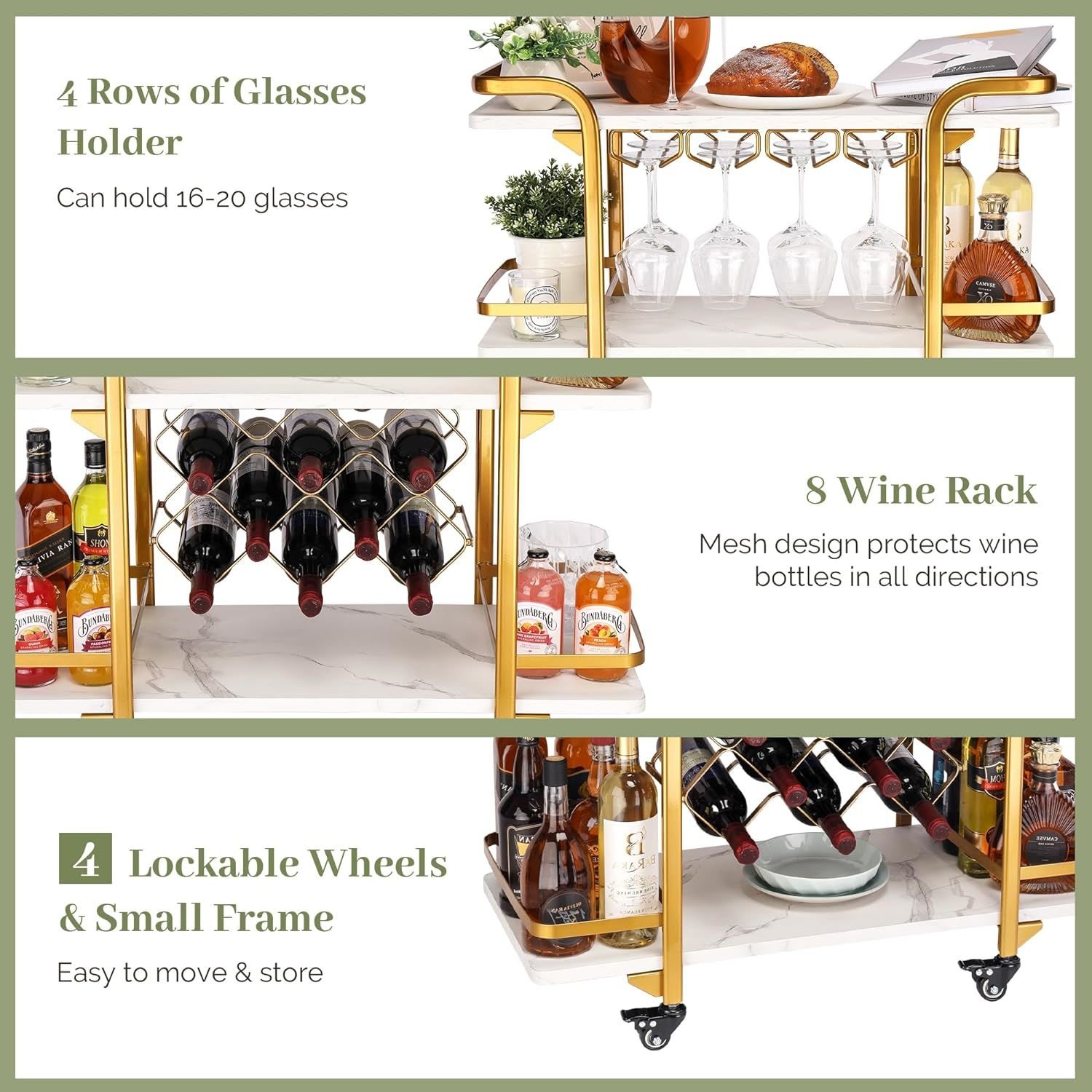 [4 Lockable Wheels ] 4 swiveling lockable wheels at the bottom to roll the wine cart from one space to another conveniently and easily. The lockable design also prevents sliding when stopped, more stable. Bar cart with wine rack is suitable for the home, kitchen, bar, restaurant, outdoor and indoor. Buy the cocktail cart now!